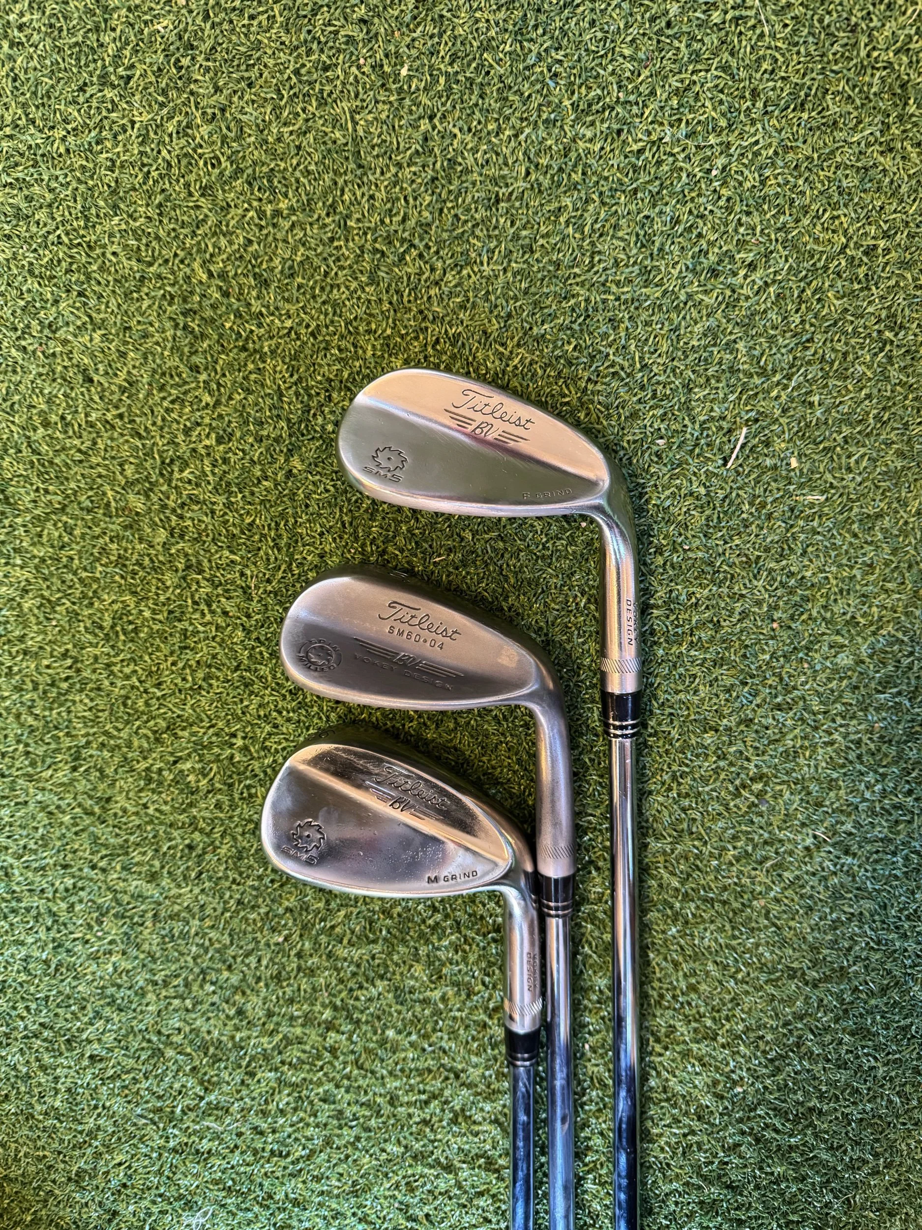 Clean 3-wedge set of Titleist Vokey Design SM6 wedges: 52°, 56°, and 60°. Heads have been buffed and polished, with faces sandblasted for a fresh, uniform look and crisp presentation. Great setup for gapping and versatile short-game shots. Golf pride grips.